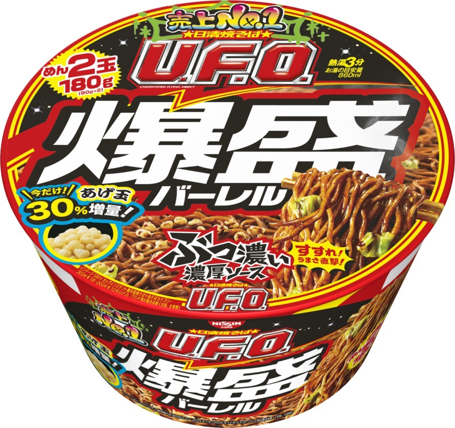 「日清焼そばU.F.O.爆盛バーレル」は、「U.F.O.」史上最重量となる180gの麺と、「U.F.O.」ならではの"ぶっ濃い濃厚ソース"を心ゆくまで味わうことのできる商品。