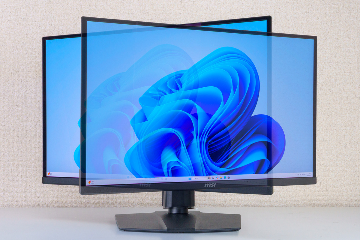また、上位モデルにはLEDイルミネーションが搭載されていたが、本製品では省かれている。LEDイルミネーションがあるとゲーミングディスプレーらしいのは確かだが、最近のMSI製品でも非搭載モデルが多くラインアップされている。設置したときに背面が壁の場合は直接目にしないので、それで価格が下がるのであれば、そのほうがありがたい環境の人もいるだろう。