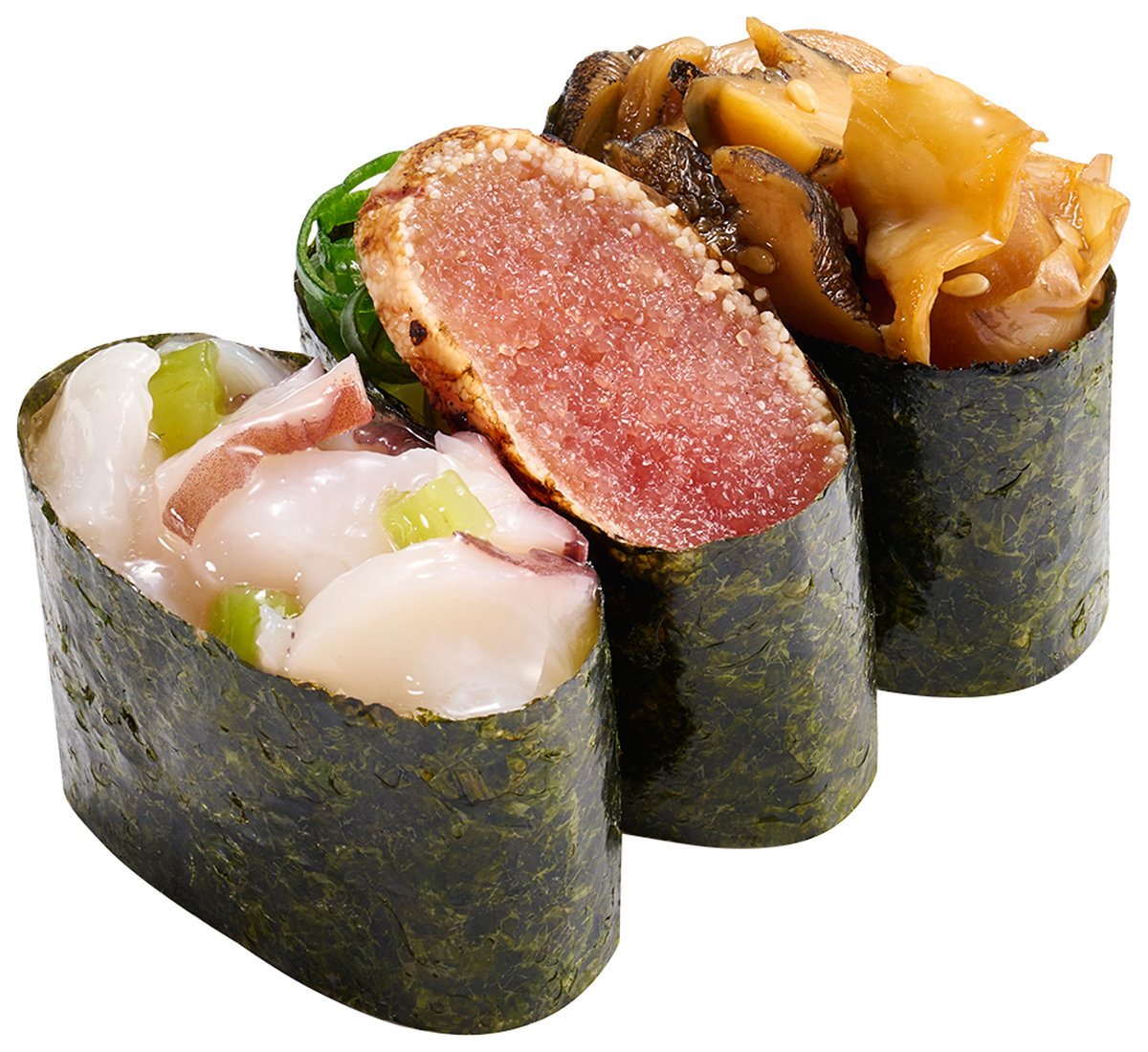 また、いわし・丘つぶ貝・水たこ昆布〆梅肉のせの3種類を一皿で味わえる「なまら北海道3貫盛り」や、たこわさび・炙りたらこ・毛つぶ貝を組み合わせた「北海道軍艦3貫盛り」もラインアップに加わります。