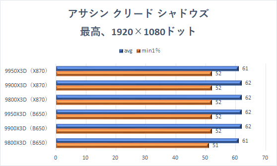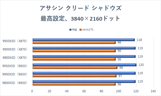 Radeon RX 9070 XTでも、4Kゲーミングはちょっと厳しくなるヘビー級タイトルとなる「アサシン クリード シャドウズ」。X870とB650に差はみられず、両環境で安定したフレームレートを発揮している。