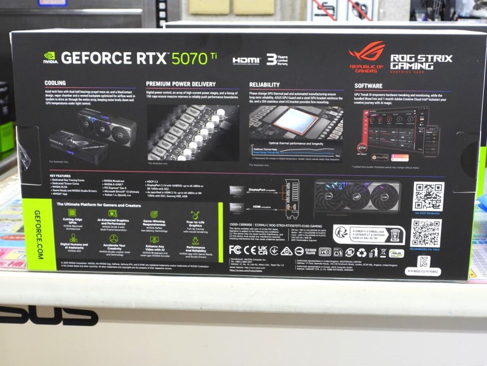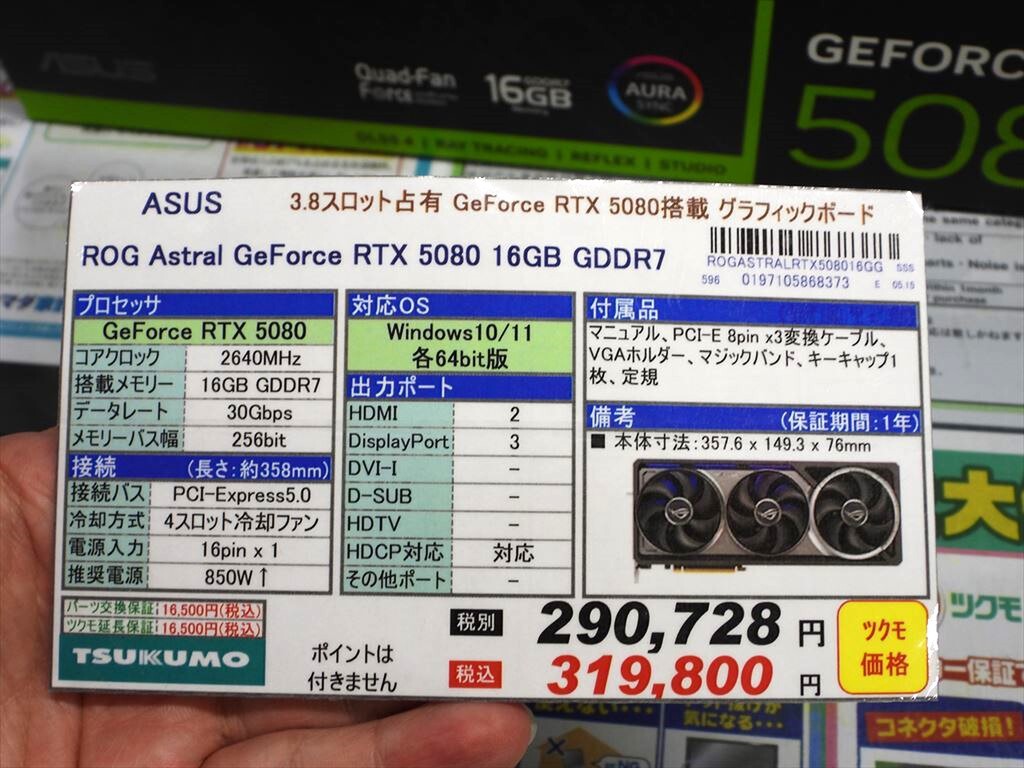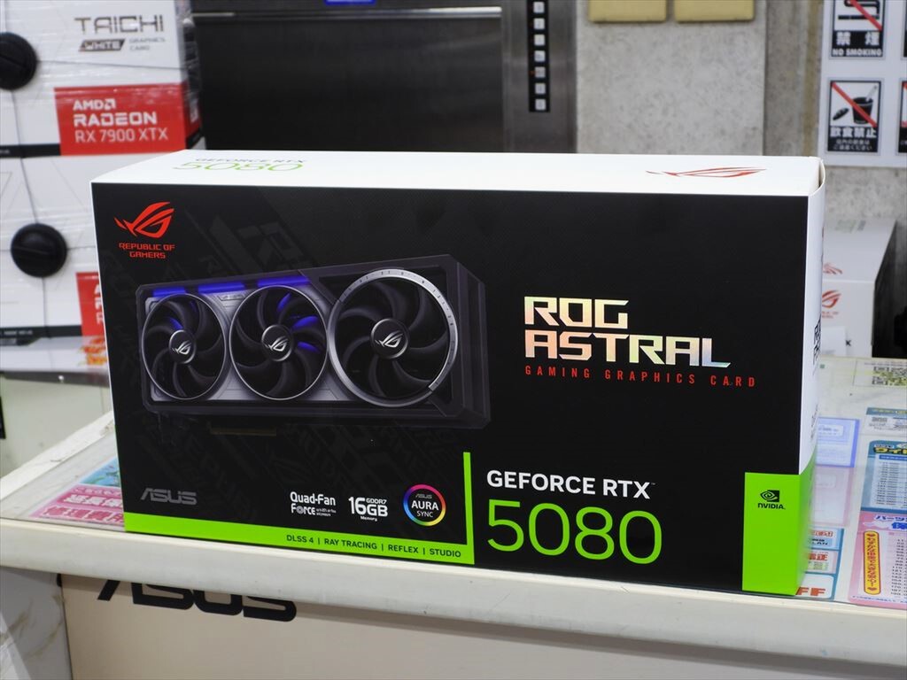 ASUSからGeForce RTX 5080搭載ビデオカード「ROG-ASTRAL-RTX5080-16G-GAMING」が登場した。価格は31万9800円。秋葉原ではツクモパソコン本店、TSUKUMO eX.で入荷を確認できた。