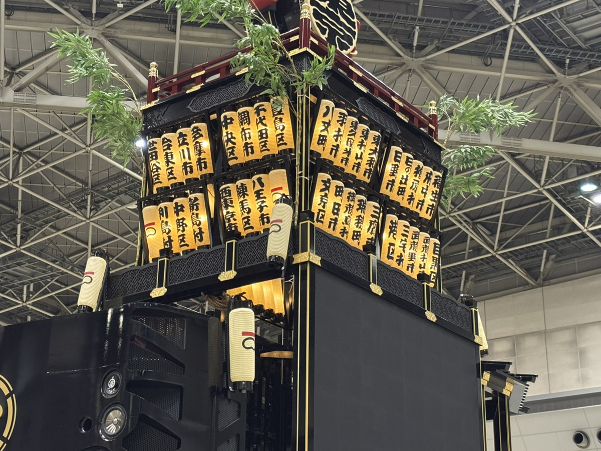 モビリティーを一番下で支えるのは伝統的に縁起がいいとされる亀で、その上にはお囃子隊が演奏するお囃子エリアが設けられています。担当者に聞いたところ、なんでも5人くらいまでは乗れるそう(切実に乗ってみたい)。そして最上段には東京都の区市町村名を1つ1つ記した提灯が光っています。