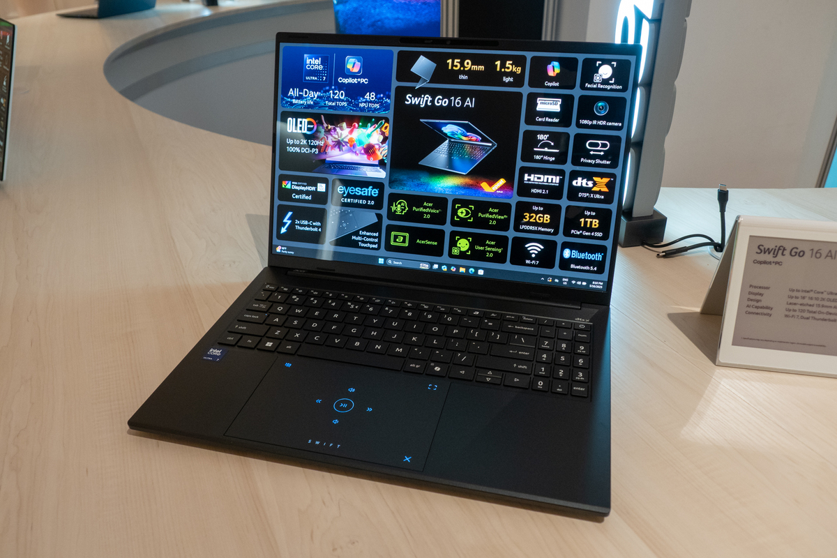 日常使い向けの「Swift Go 16 AI」および「Swift Go 14 AI」は、インテルCore Ultraプロセッサーを搭載したCopilot+ PCモデルであり、Qualcomm製やAMD製CPU搭載モデルも用意されている。最大32GB LPDDR5Xメモリー、最大2TB PCIe Gen 4 NVMe SSDを搭載可能。約16時間のウェブブラウジングが可能なバッテリー性能もポイントのひとつ。強化されたMulti-Control Touchpadは、メディアやビデオ通話の操作に対応する。