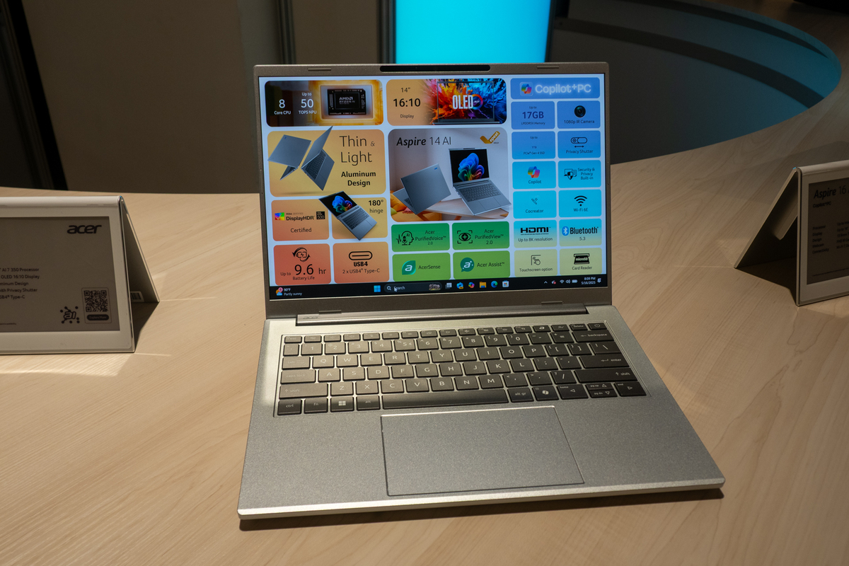 「Aspire AIシリーズ」は、Copilot+ PCとして拡充され、14インチおよび16インチモデルで、インテルCore Ultra(Series 2)、AMD Ryzen AI 300シリーズ、Snapdragon Xプロセッサーを搭載したモデルがあり、いずれもAI機能を強化。RecallやClick to DoなどのCopilot+ PC機能に加え、Acer独自のAIアプリケーション群(AcerSense、Acer LiveArt 2.0、Acer PurifiedView 2.0、Acer PurifiedVoice 2.0)を備える。