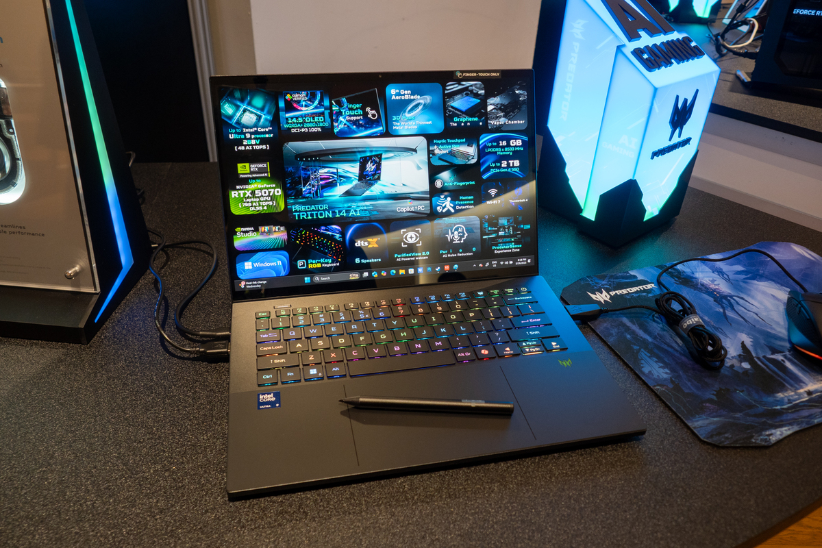 プレミアムゲーミングノートパソコン「Predator Triton 14 AI」は、ゲーマーだけでなくクリエイターのニーズも満たすように設計されている。最大でインテルCore Ultra 9プロセッサーとNVIDIA GeForce RTX 5070 Laptop GPUを搭載可能。約1.6kg、薄さ17.31mmのアルミニウム製筐体はアンチフィンガープリントコーティングが施されていて、指紋がつきにくい。