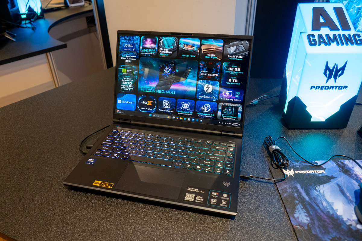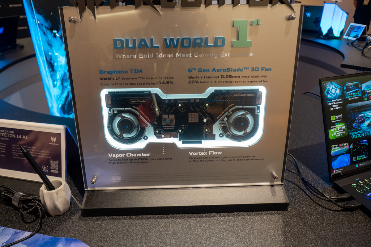 より手頃な価格帯として提供されているのが「Predator Helios Neo 14 AI」。最大でインテルCore Ultra 9プロセッサーとNVIDIA GeForce RTX 5070 Laptop GPUを搭載。第5世代AeroBlade技術、液体金属サーマルグリス、Vector Heat pipe、Vortex Flowシステムによる冷却を採用しているのがポイント。