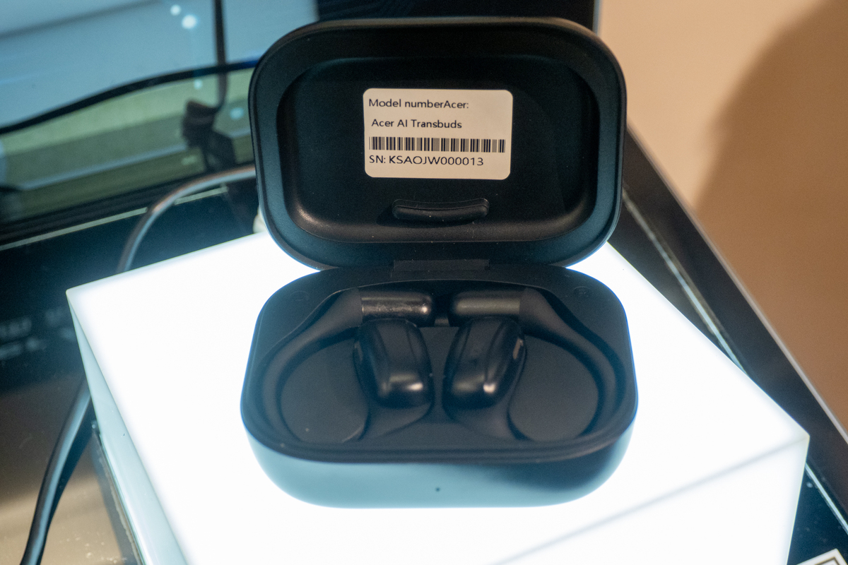 「Acer AI TransBuds」は、軽量・コンパクトなAI翻訳イヤホン。プラグインレシーバー経由でスマートフォンやタブレットに接続し、リアルタイムの双方向音声翻訳を15の主要言語で提供する。翻訳のために着用するのは片側のみでオーケー。ライブキャプションや文字起こし機能もサポートする。