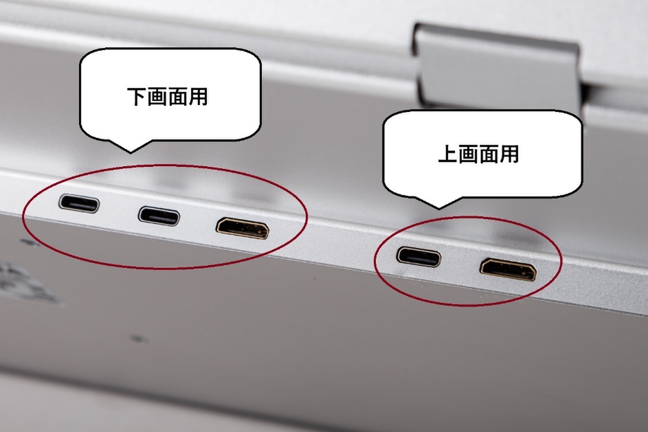 インターフェースはヒンジ付近で、各端子の間にちょっとしたスペースがある。左のブロックは下画面用、右のブロックは上画面用の入力端子と分かれているわけだ。