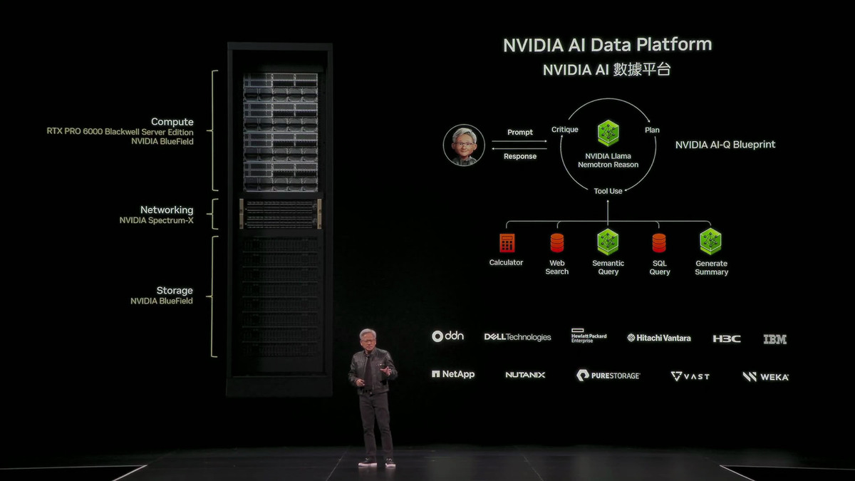 さらにファン氏は、ストレージ分野でも再発明が必要となると述べている。人間がSQLのような構造化データベースをクエリするのに対し、AIは非構造化データから意味(セマンティクス)を抽出したいと考える。このため、NVIDIAは「NVIDIA AI Data Platform」と新しいクエリシステム「NVIDIA IQ」を発表した。