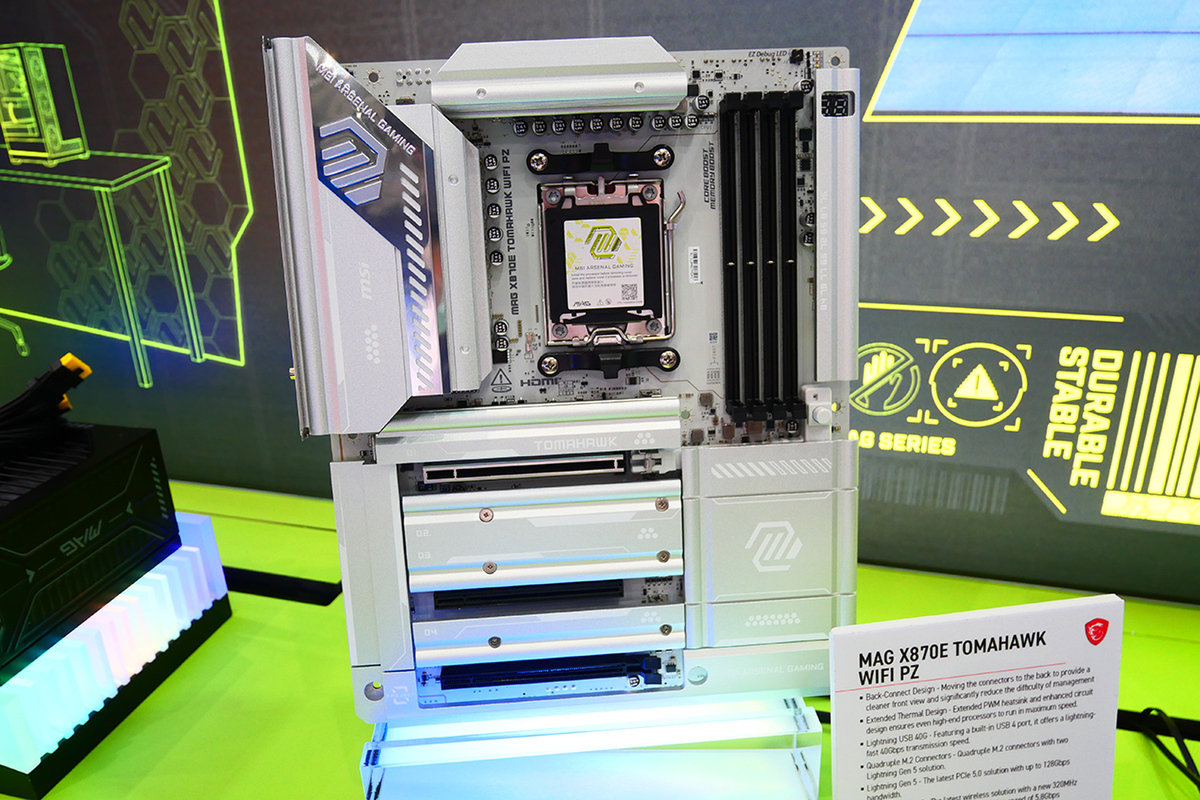 まずは、マザーボードから。裏配線を採用するX870Eマザーボード「MAG X870E TOMAHAWK WIFI PZ」が登場。裏配線を採用することでケース左サイドから見たときにこまごまとしたケーブルがまったく見えないのが特徴。加えて、ホワイトとシルバーを組み合わせることで、自作パソコンでホワイトに統一したいときにありがたいカラーとなっている。
