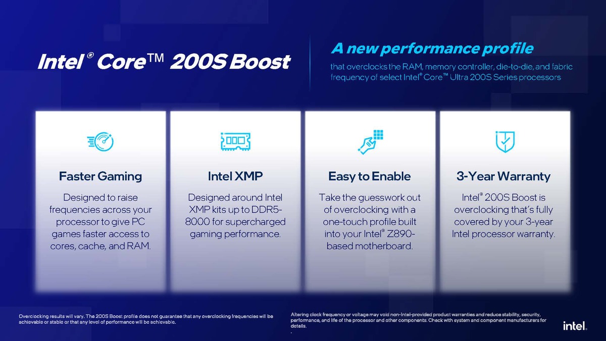 ゲーミング向けの機能として、特定のCore Ultra 200Sシリーズプロセッサー向けにIntel 200S Boostという新しいパフォーマンスプロファイルが導入された。これはBIOSで設定可能で、RAM、メモリーコントローラー、ダイ間、ファブリック周波数をオーバークロックでき、最大DDR5-8000のIntel XMPキットに対応する。