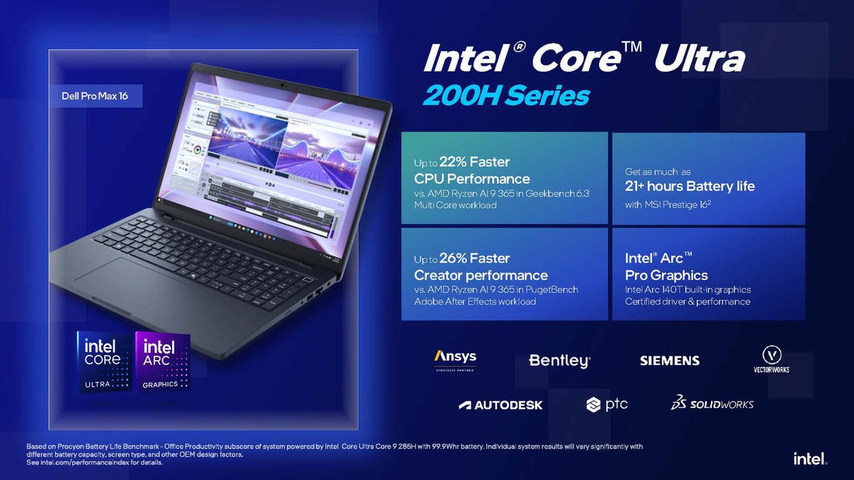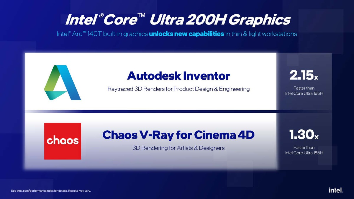 内蔵グラフィックスであるIntel Arc 140Tは、Chaos V-Ray for Cinema 4Dにおいて前世代(Core Ultra 185H)比で最大1.30倍高速な3Dレンダリング性能を実現。Autodesk InventorのGPU Ray Tracingワークロードでは最大2.15倍高速。Performance per Wattは、Core Ultra 9 185Hに対し、Cinebench 2024マルチコアで最大21%向上している。