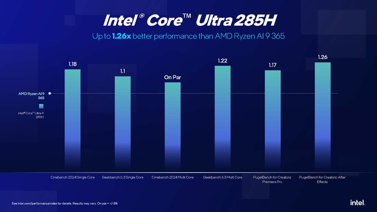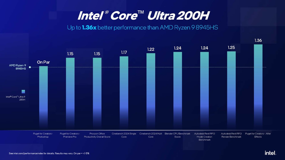 Core Ultra 200Hシリーズは、薄型軽量フォームファクター向けに高性能を提供する。AMD Ryzen 9 8945HSと比較したテスト(Core Ultra 9 285H vs Ryzen 9 8945HS)では、Cinebench 2024シングルコアで最大+17%、マルチコアで最大+22%高速なCPU性能を示した。
