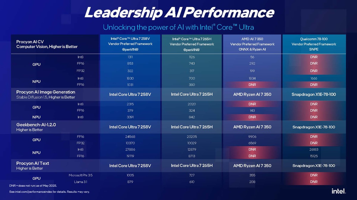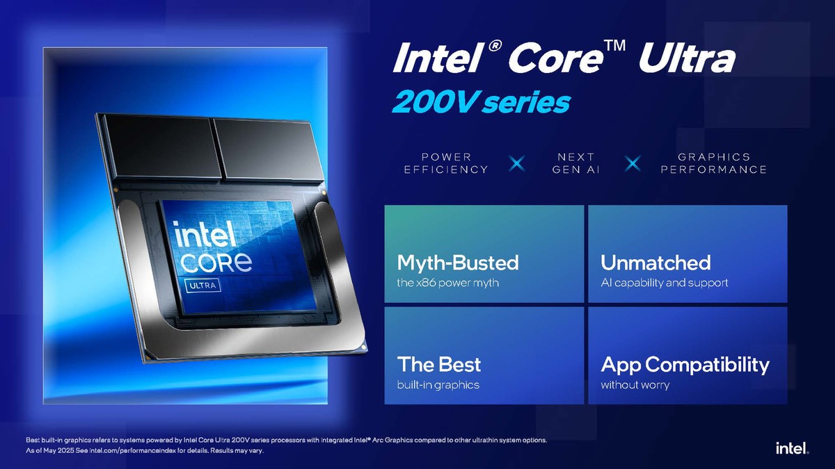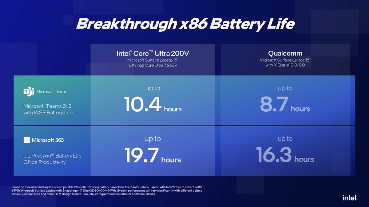 Core Ultra 200Vシリーズはプレミアムモバイル向けで、Lunar Lakeアーキテクチャーに基づいて設計。x86プロセッサーが電力効率に劣るという認識を払拭することを目指したと強調。Microsoft Surface Laptopを使用したバッテリー寿命テストでは、Snapdragon X Elite搭載システムと比較して、Microsoft TeamsではCore Ultra 200Vが10.4時間に対して、Snapdragon X Eliteでは8.7時間。UL Procyon Office ProductivityでCore Ultra 200Vが最大19.7時間なのに対し、Snapdragon X Eliteでは16.3時間 となり、優れた持続時間を示した。