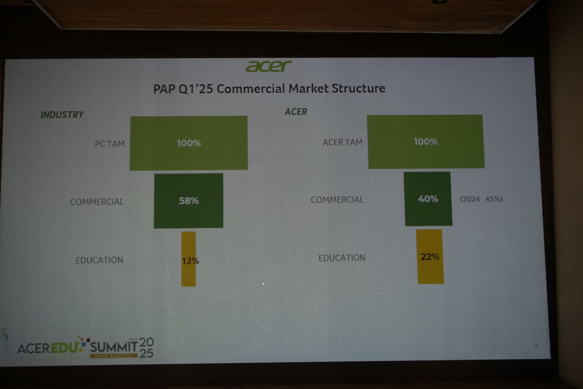 PAP地域の収益の40%から45%がコマージャル・セグメントからもたらされており、特に教育市場が重要だと強調。インドネシア、フィリピン、インド、ニュージーランドなどで教育市場において高いシェアを占めている。フィリピンでは「Education without Acer is nothing(Acerなくして教育なし)」という言葉も生まれたと紹介した。