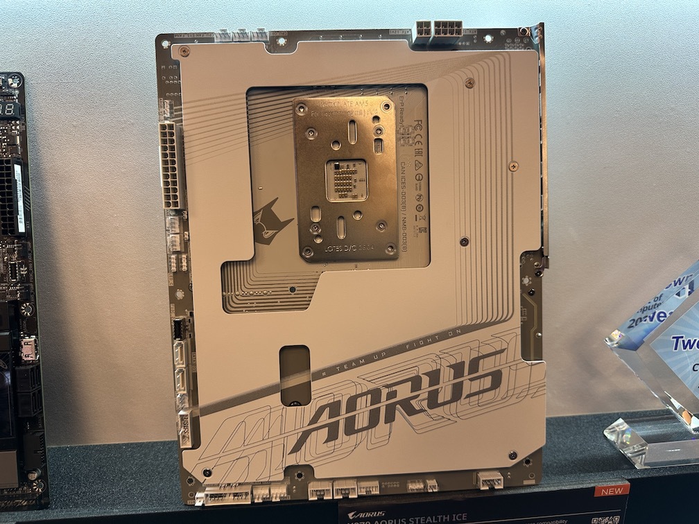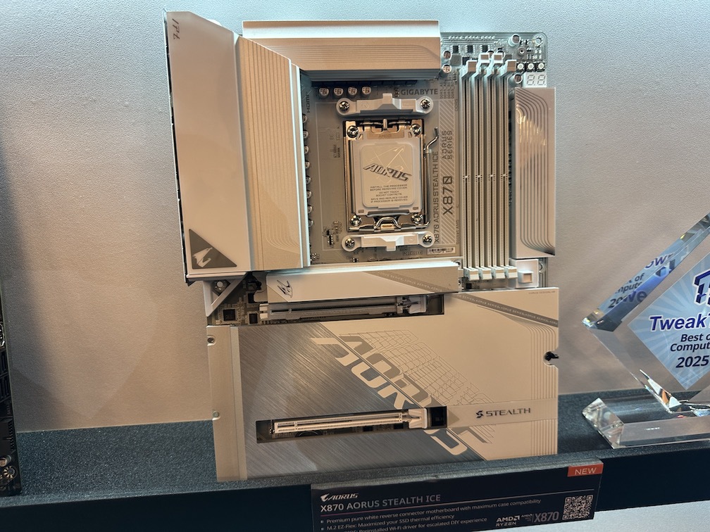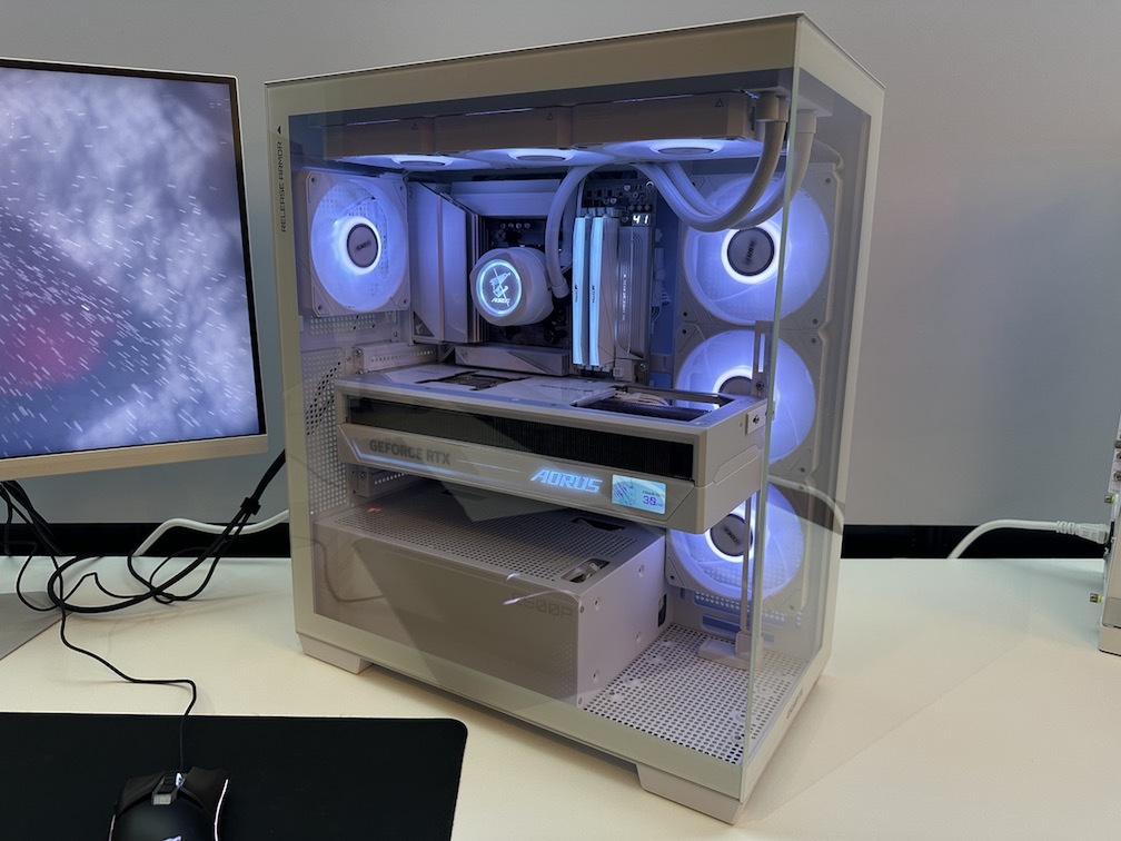 会場では、「STEALTH ICE」シリーズによるビルド例を展示していた。ビデオカード「AORUS GeForce RTX 5090 STEALTH ICE 32G」との組み合わせにより、表面からはほとんど配線が見えない。ケース内部のパーツを存分に魅せるショーケースとして完成されていた。ケーブルの存在を極力排除した美しいビルドは、見た目の良さだけでなく、空冷効率にも良いだろう。