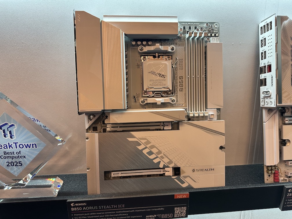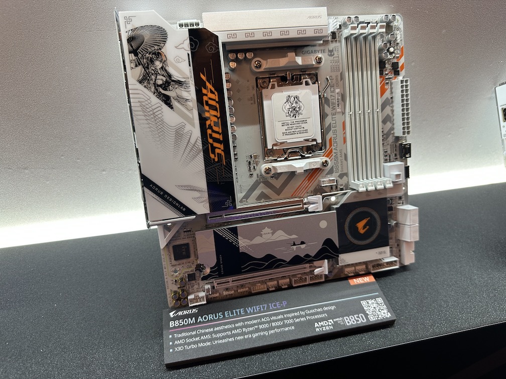 最新のX870およびB850チップセットを搭載したAORUSマザーボードもラインアップを新調。X3D Turbo Mode 2を搭載した「X870E AORUS MASTER X3D ICE」や「PRO」「ELITE」といったモデルでは、AIによるリアルタイム制御により最大35%のパフォーマンス向上を実現。さらに「STEALTH ICE」シリーズでは、ケーブルを裏配線するリバースレイアウトを採用し、ビルドの美しさと作業性の向上を両立している。