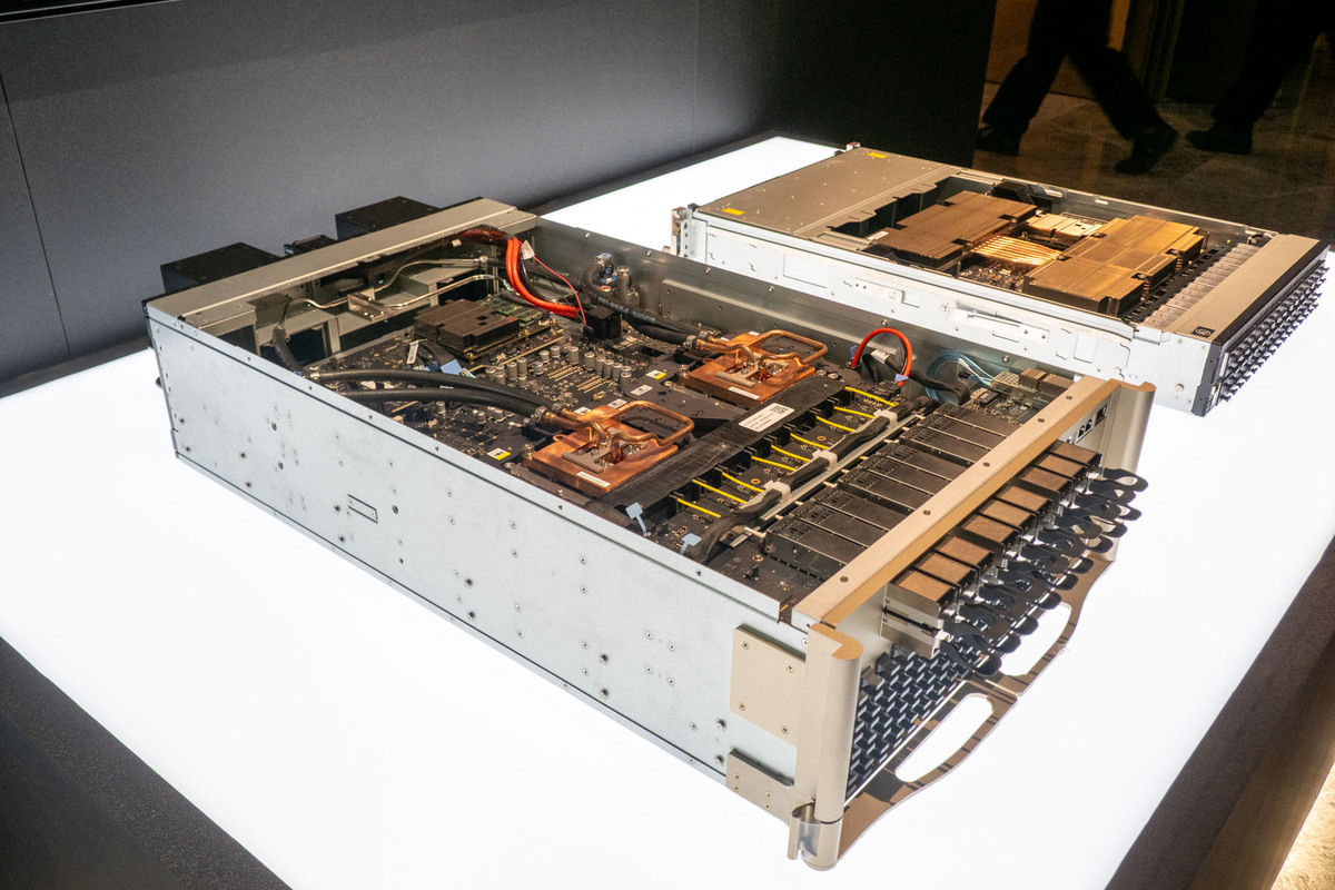 データセンターにおけるネットワーキングも重要な要素として展示された。NVIDIAはイーサネットおよびInfiniBandのスイッチを開発しており、その内部で動作するASICも開発している。最新のモデルでは、光ケーブルをGPUに直接装着できるようにすることで電力効率を高めているという。