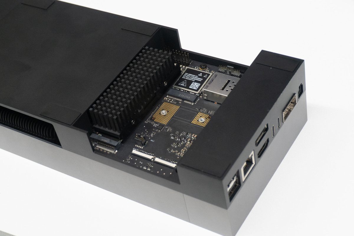 次世代のエッジおよびロボティクス向けコンピューティングプラットフォームとして、新しいJetson AGXを搭載したモジュールが展示された。データセンターの加速空間上でしっかりとトレーニングしたAIモデルを、このエッジデバイスに実際に搭載して動作できる。豊富なインターフェースを備え、さまざまな用途の開発に対応できるとしている。これは、データセンターからエッジまでのハードウェアおよびソフトウェアを、Physical AIの実現に向けて構築・提供するというNVIDIAの戦略の一環である。