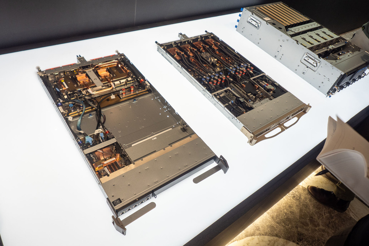 データセンター向けAIインフラの中核として、最新のBlackwellアーキテクチャーに基づくシステムが展示された。空冷式のHGX B300や、水冷式のラックマウントシステムGB300 NVL72が紹介された。GB300 NVL72はNVLink Switchと、Blackwell Ultra GPUを採用した水冷式のラックスケールデザインを特徴としている。ラックあたり72基のGPU、36個のArmベースのNVIDIA Grace CPUを搭載することで、大規模なAI計算能力を効率的に集積できる。