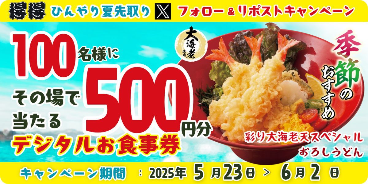 うどんチェーン「得得」は5月23日20時から6月2日まで、公式Xアカウントにて「Xフォロー&リポストキャンペーン」を実施します。