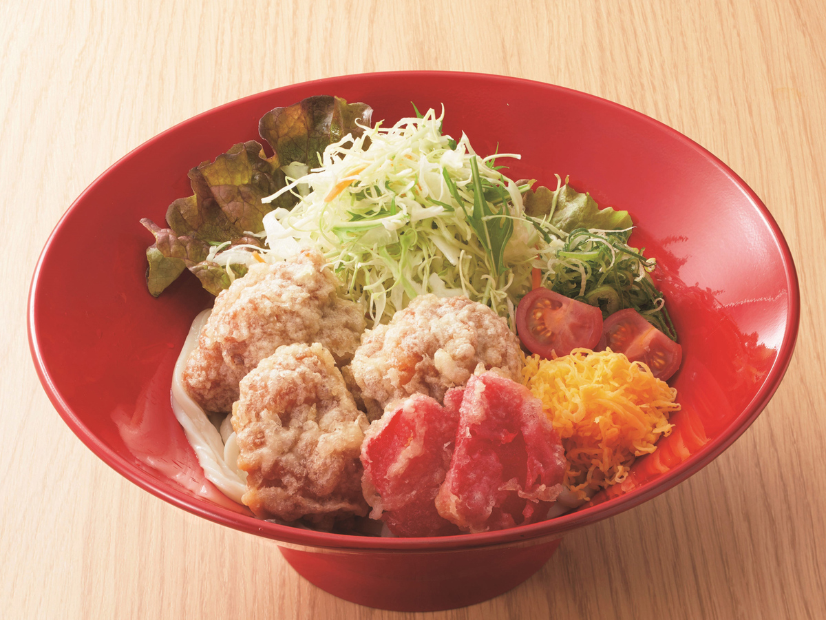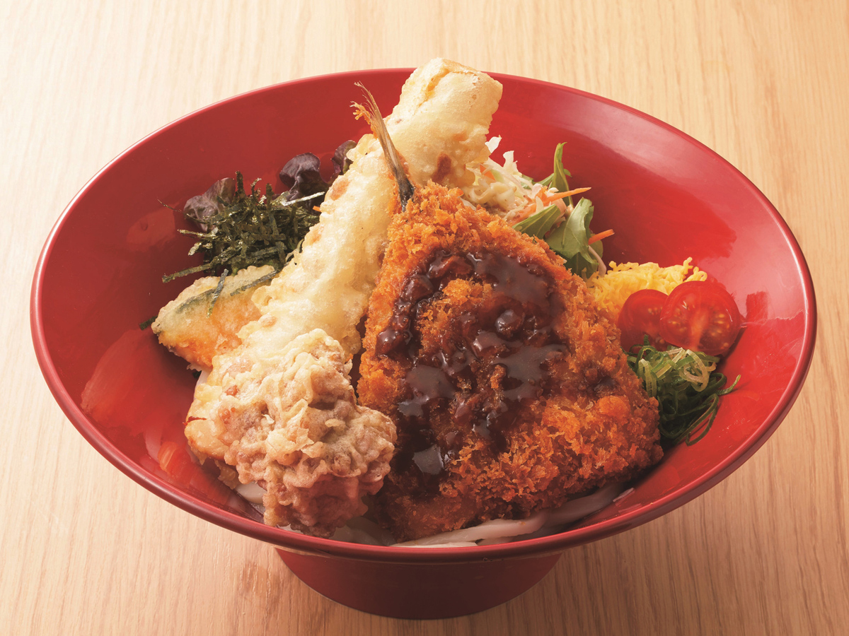 現在、「季節のおすすめうどん」を期間限定で販売中です。目玉は、「得得ぶっかけうどん」。サクサクのあじフライ、ちくわ天、得とり唐天、かぼちゃ天という豪華トッピングを揃えます。得得では3玉まで同一価格で提供してくれるのもポイントですよ。