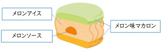 メロン味のマカロン生地に挟まれるのは、北海道産のメロン果汁を使用したアイスとソース。旬の時期に向けてメロンづくしで、上品な甘みと香りが口いっぱいに広がるという。