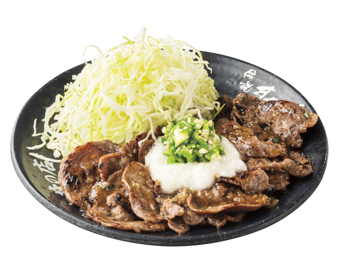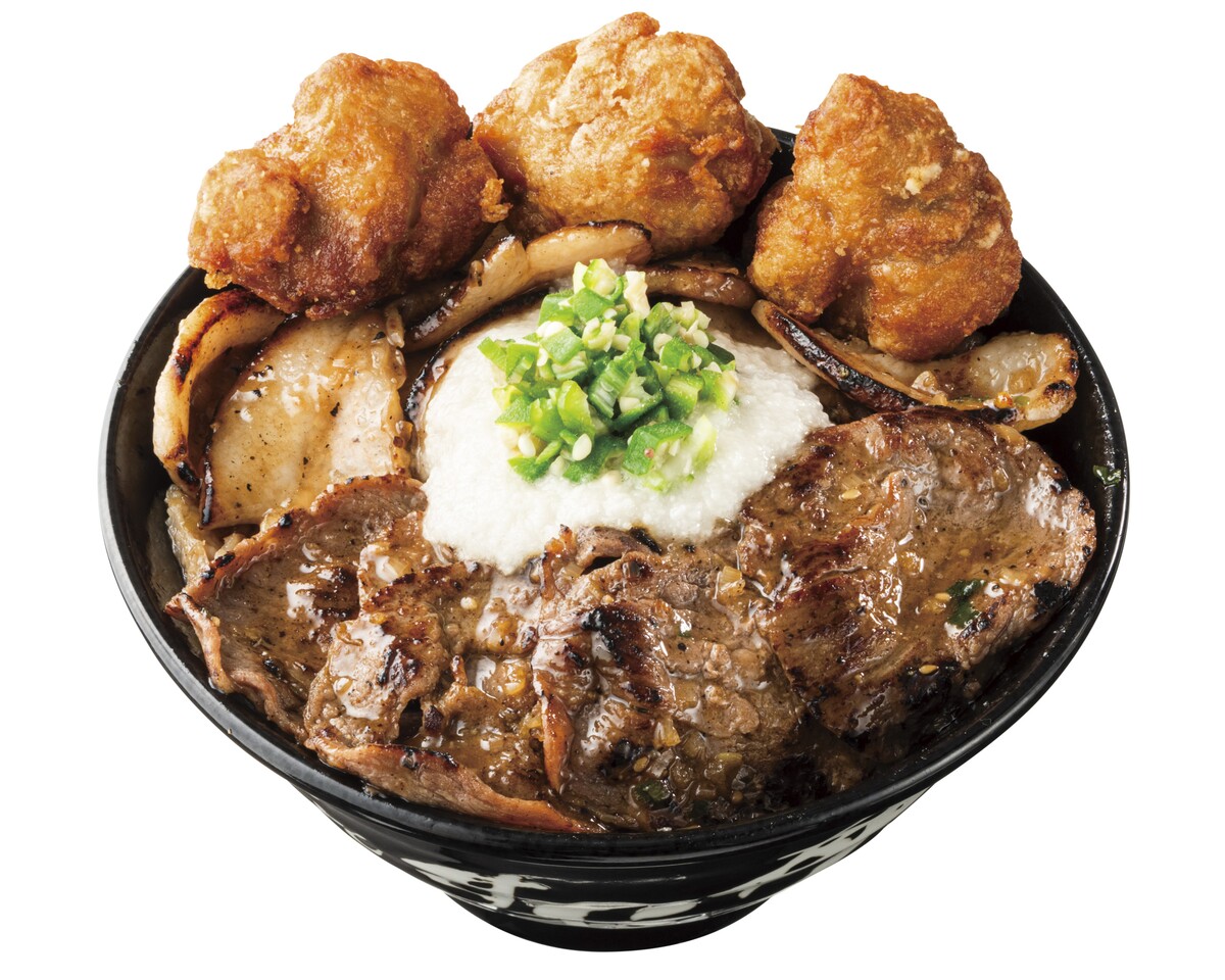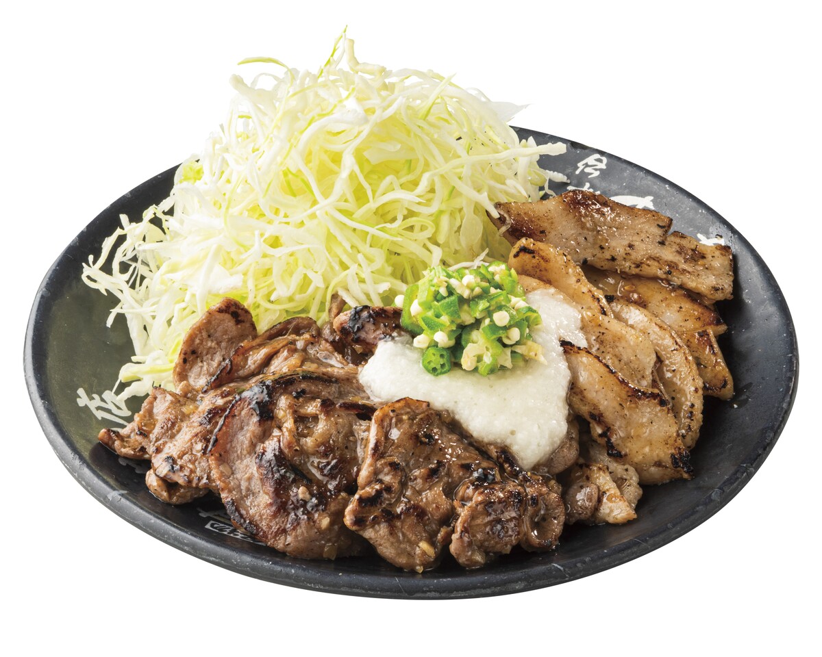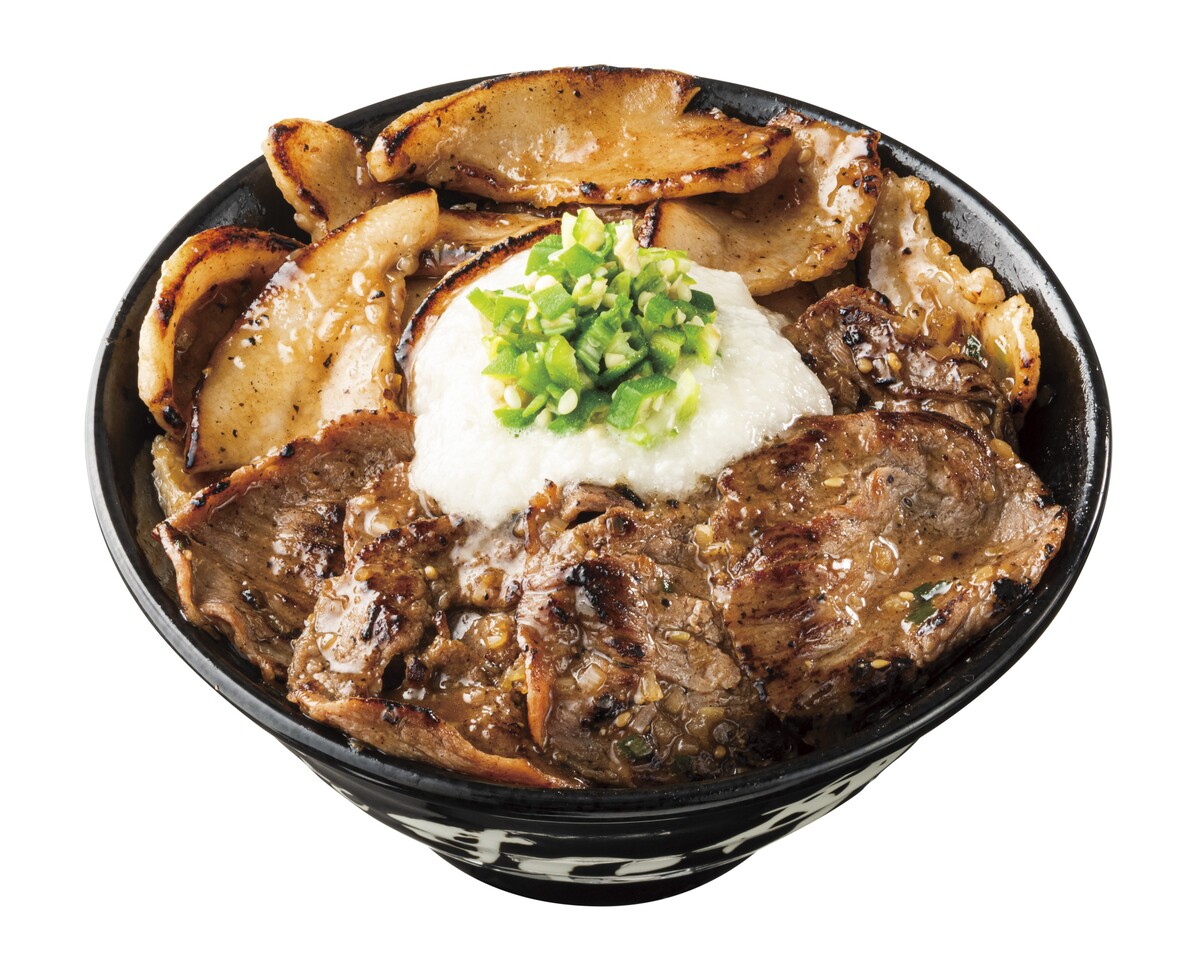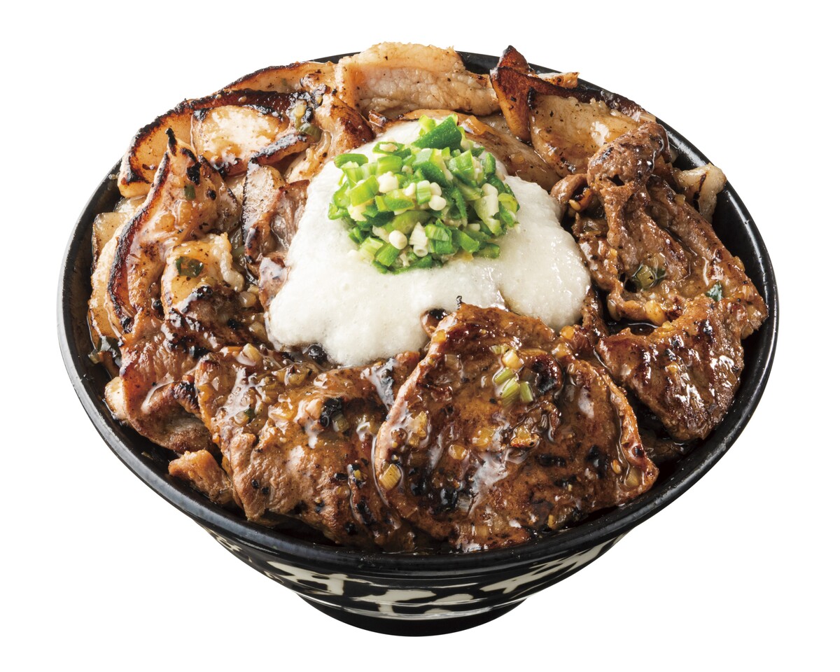 希少部位である牛タンと食感の良い豚トロを特製の「すたみなさっぱり塩ダレ」で香ばしく焼き上げた後、茶わん三杯分もの大盛りご飯の上に盛り付け、その上にとろろと刻んだオクラをトッピングした、肉量約170gのすたみな満点のぶっかけ肉丼。