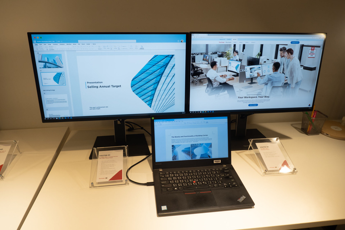 「VG2752-2K」と「VG2758-2K」はデュアルディスプレー設定として紹介された。VG2758-2KはUSB Type-Cドッキングディスプレーで、デイジーチェーン機能を備える。両モデルとも100Hzのリフレッシュレートで滑らかなビジュアルを提供し、IPSパネルによりクリアな色再現を実現する。