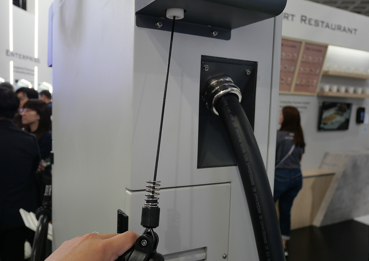 そして、展示モデルで一番巨大だったのが、「EV SE HYPER 80 DUAL」だ。こちらはショッピングモールといった商業施設向けのモデルで、2台の同時充電が可能となっている、10.1インチのディスプレーを搭載しており、RFIDカードでの支払いや、車両認識とリンクした支払いによる自動充電、クレジットカード支払い、モバイルペイといった支払方法にも対応している。