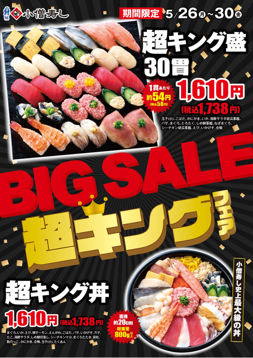 持ち帰りすしの「小僧寿し」は、「BIG SALE『超キング』フェア」を5月26日から30日の期間で開催します。期間中、「超キング盛 30貫」と「超キング丼」を発売。価格はいずれも1738円。