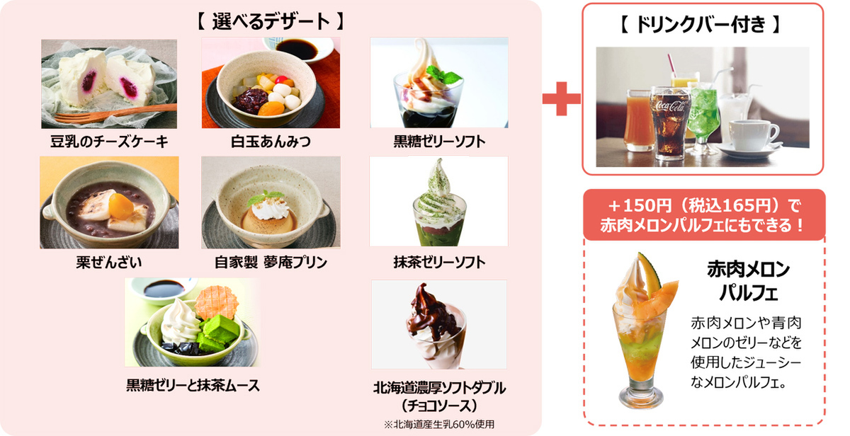 対象メニューを注文した人には、385円でドリンクバーとデザートがセットになるお得な追加オプションも用意されています。