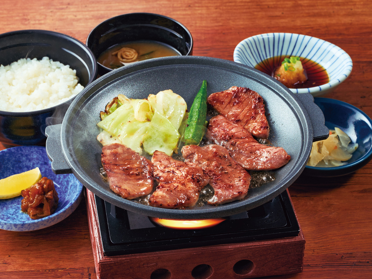 注目は、脂の乗った牛タンを熱々のまま楽しめる「牛タン焼き御膳」です。厚切りの牛タンを使用し、塩&レモンやおろしポン酢、南蛮味噌など4種類の調味料で味の変化を楽しめます。