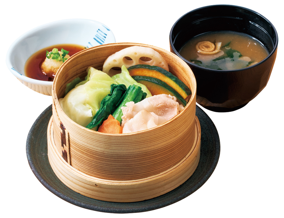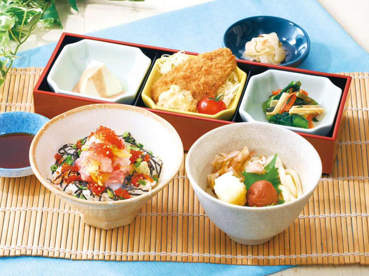 小丼には、ねぎとろやいくらを盛り付けた海鮮丼、活〆穴子の天丼、あさりの旨味を生かした深川丼をラインアップ。椀物には、野菜と豚肉のせいろ蒸しや、めかぶそば、梅おろしうどんなど、季節感と健康志向を兼ね備えた内容となっています。