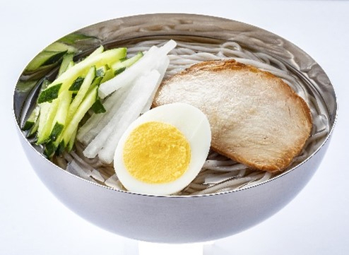 「ビビン冷麺」は、もちもちとした平麺と、具材(キムチ、チャーシュー、きゅうり、豆もやしナムル)を、コチュジャンを使用した甘辛たれで和えて食べる冷麺。隠し味にりんご酢を加えているそうです。