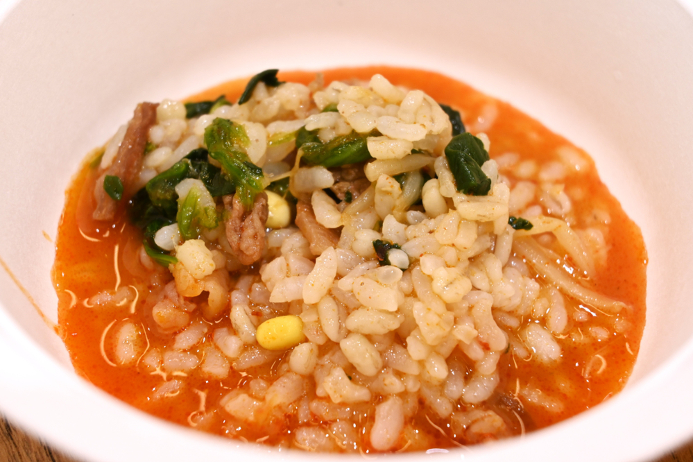 お肉しっかり入っていて、さらにもやしなど食感のある野菜を楽しめるのがうれしい! 旨辛スープはまさに本格的な味わいで、文句なしのおいしさです。なんでも、もち麦と白米はおいしく炊くための浸水時間や炊き時間が異なるそうで、セブン-イレブンではそれぞれを最適な状態で炊き上げてから合わせているんだとか。そのおかげで、お米の粒感がちゃんと生きています。