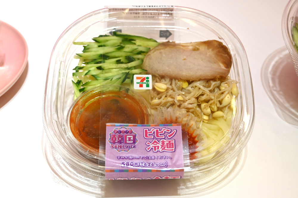 チルド麺とは思えないくらいつるもちした本場の質感に近づけたセブンの「ビビン冷麺」。正直に言ってかなりおいしい! 発表会の会場でも好評でした。フェア期間中にリピートしたい一品です。