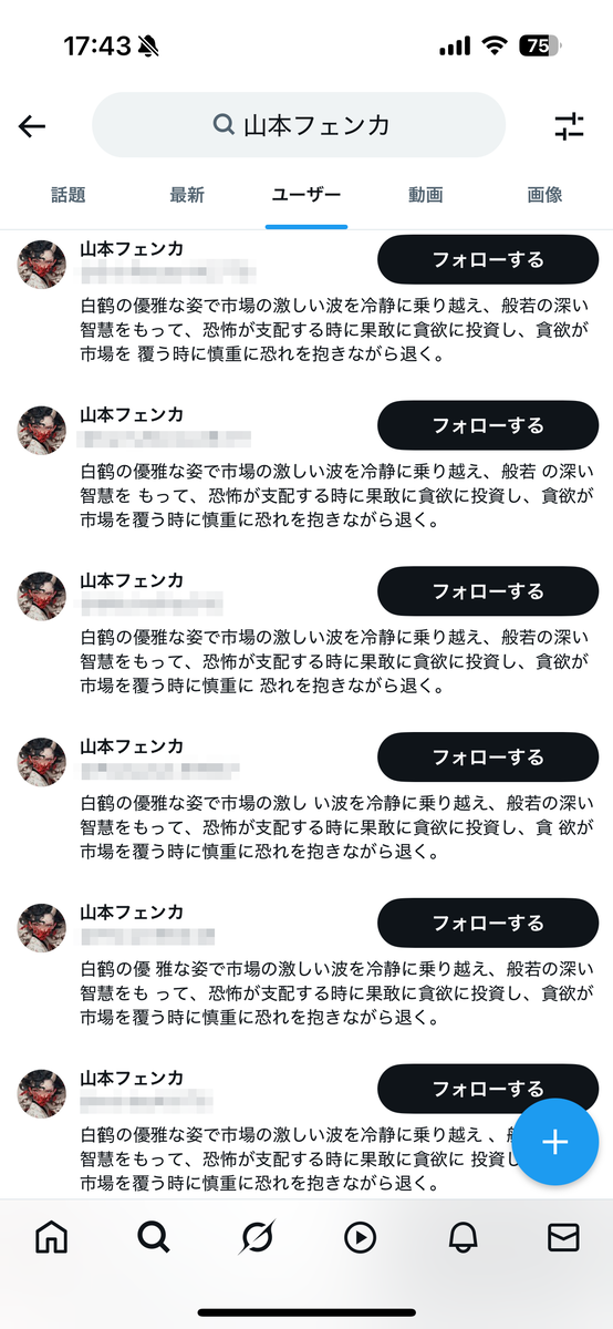 そう思って「山本フェンカ」でユーザー検索したら、アカウントが出るわ出るわ。もちろんDMを受け取った人がXに報告などしてそれらのアカウントが凍結されることもあるのでしょうが、そのたびに新しいアカウントを作って同じことを繰り返すため、いたちごっこの様相を呈しているのだと思われます。