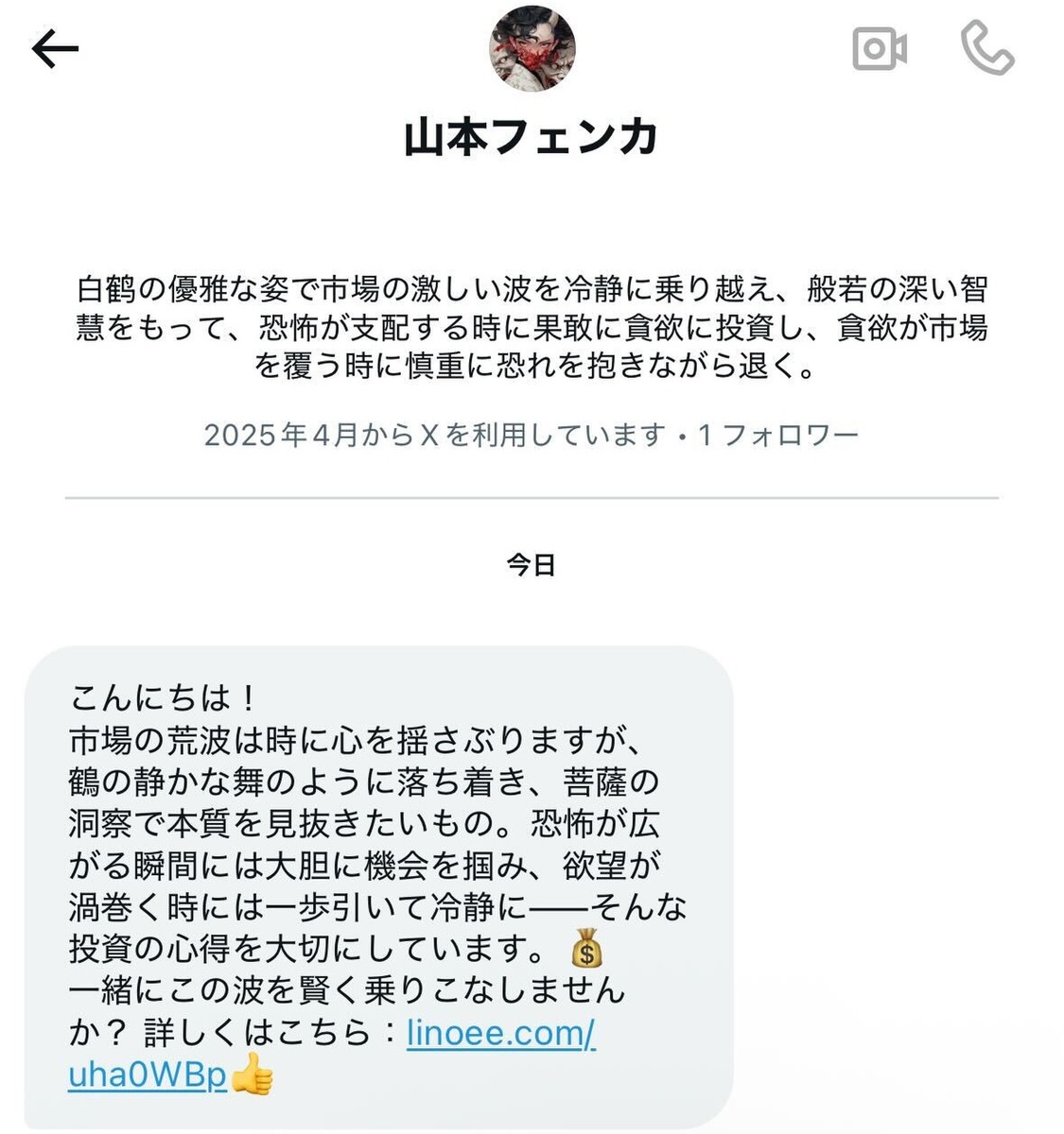 実は筆者、この手のスパムDMを受け取るのは初めてではありません。ちょっと前に、「山本フェンカ」なるアカウントからまったく同じ文面のDMが送られてきたことがあります。そういえば、今回のDMとアイコンがまったく同じだったな……。