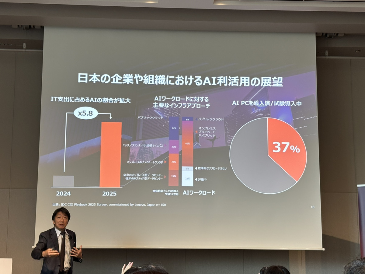 続けて、AIへの取り組みについてはIDC CIO調査の結果が共有された。それによると、昨年に比べて、日本企業のAIへの投資割合は約6割増加し、AI PCの試験導入または計画が4割近くに達していること、またAIワークロードのインフラ投資先としてパブリッククラウドよりオンプレミス、プライベート、ハイブリッドクラウドを選択する割合が高いことが明らかになったという。