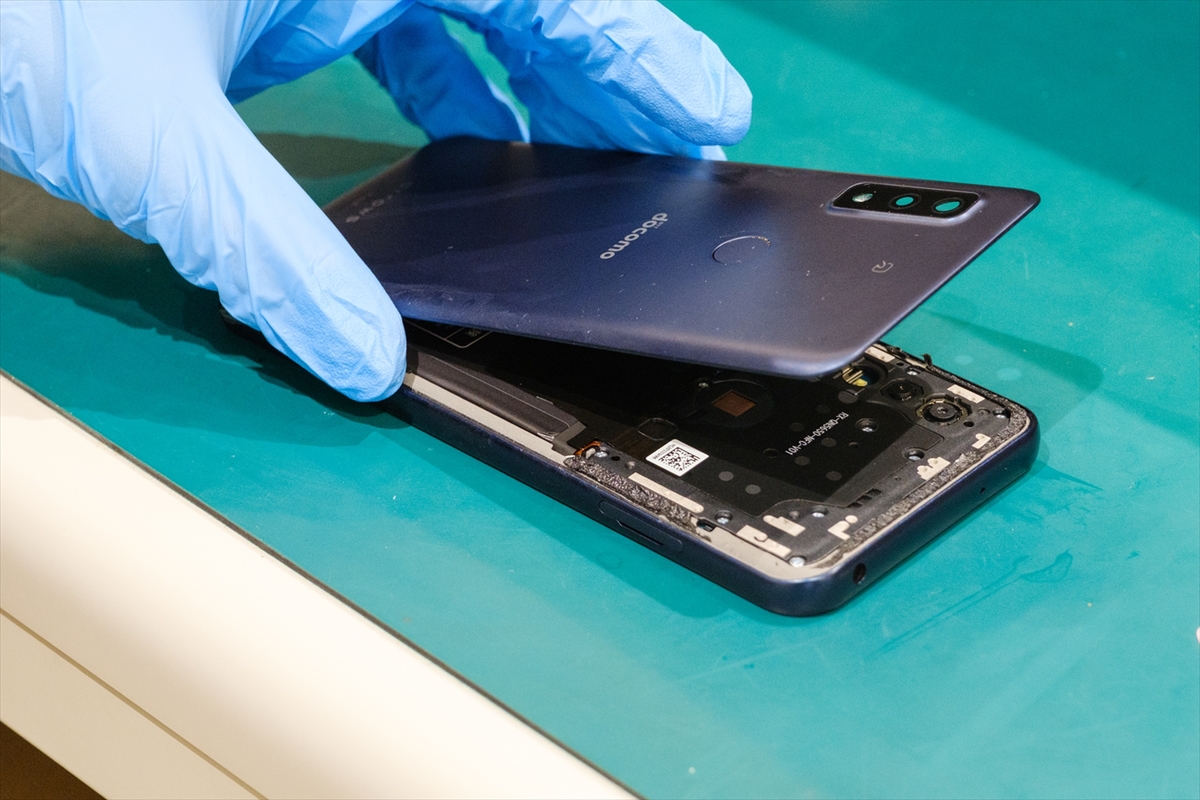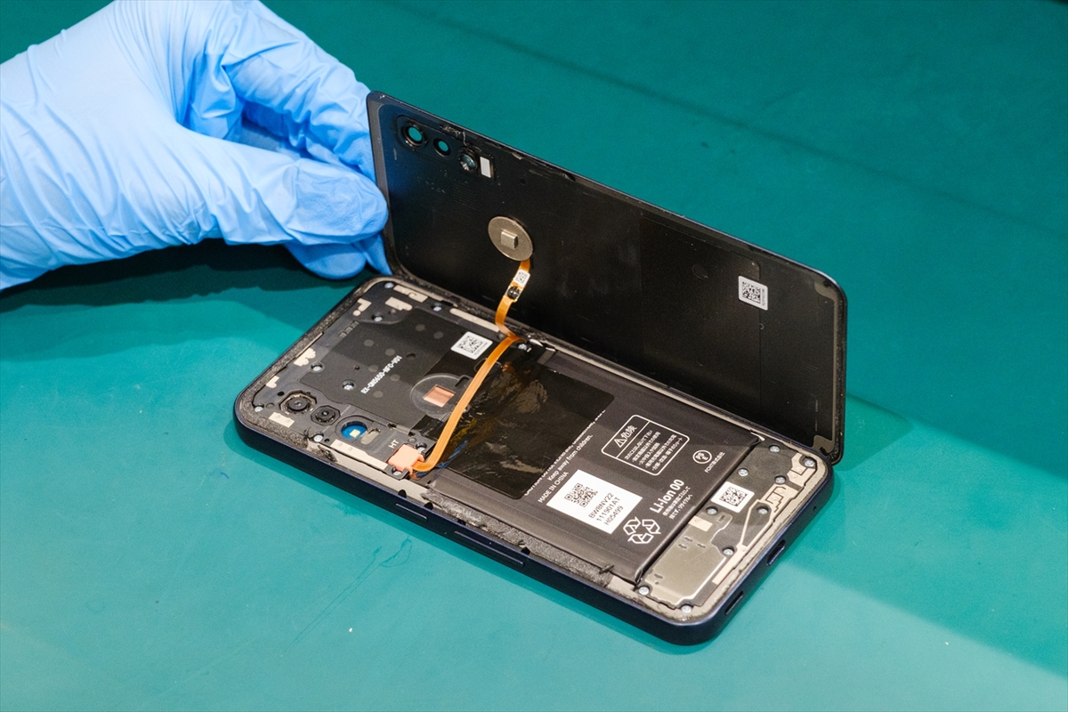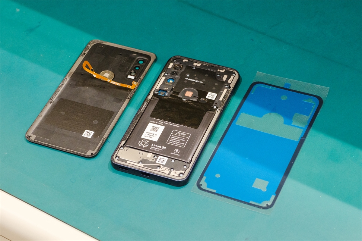 ゆっくり10分ほど温められたあと、吸盤やヘラなども使って、背面パネルがていねいに剥がされた。Android端末は背面に指紋センサーがあるため、基板と指紋センサーを繋ぐ部品も取り外された。工程は機種によって異なるようだ。