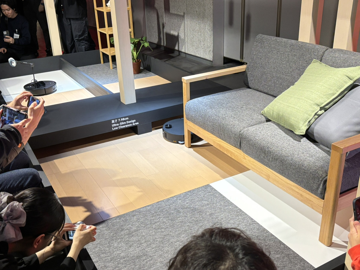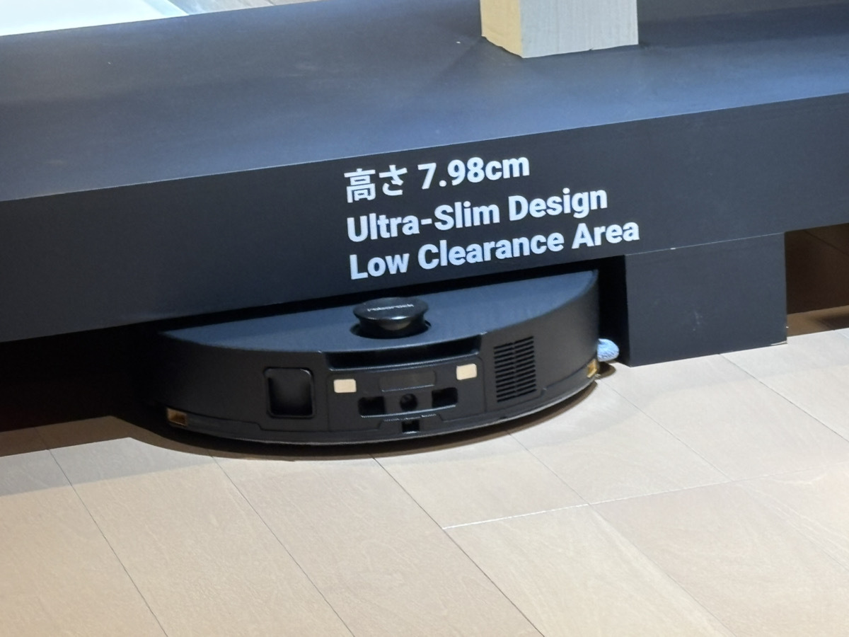 最大の特徴は、新開発の自動昇降式のLDSレーザーセンサーと上方向ToFセンサーを組み合わせた独自のナビシステムだという。このシステムにより、本体の昇降を自動制御し、本体高さを7.98cmという超薄型に抑えつつ、従来入りづらかった家具の下など低く狭い場所へのスムーズな進入と本体損傷の防止を実現している。