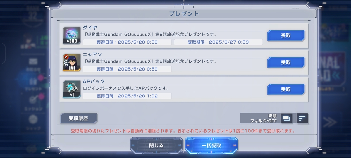 バンダイナムコエンターテインメントより配信中のiOS/Android向けガンダムシミュレーション「SDガンダム ジージェネレーション エターナル」。毎週恒例となっているTVアニメ「機動戦士Gundam GQuuuuuuX」放送記念ログインボーナスでSSRキャラクター「ニャアン」が配布された。