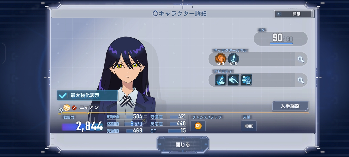 キャラクター性能を見てみるとタイプは攻撃型で、スキル「MPアップLV3」「クリティカルブーストLV3」が使えるという、あまり見ない「クリティカル特化型」の能力となっている。なお、最初からボイス(CV:石川由依さん)付きだった。