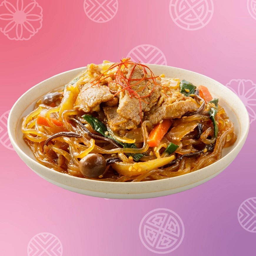 韓国の定番料理のプルコギとチャプチェを組み合わせた一品。もっちりとした春雨と野菜、甘辛い味付けの牛肉が楽しめるということ。