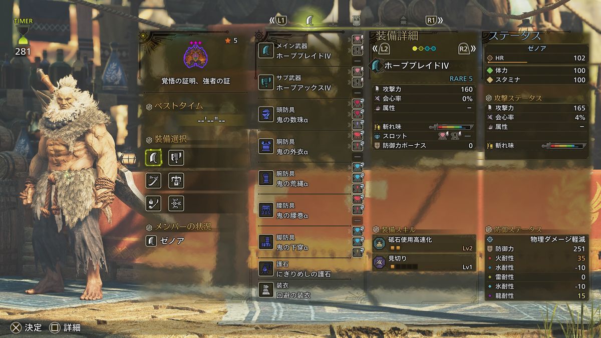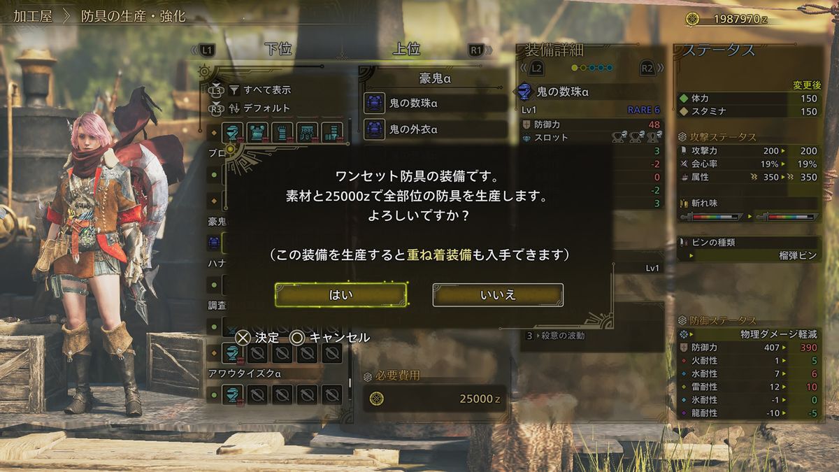 クエストを完了すれば報酬として「SF6チケット」が手に入る。豪鬼の装備は「ワンセット防具」という新しいくくりで、5部位を1回の素材で生産できた。ちなみに防御力を上げる強化は各部位ごとにLv上げが必要。装飾品のスロットも多く、普通に実戦的な性能だと感じた。