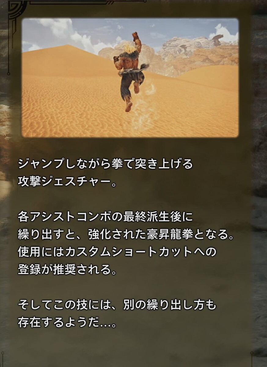 また、ジェスチャーで「Street Fighter 6 豪昇龍拳」というものが自動的に追加されている。これをショートカットに設定して呼び出すと、豪鬼が昇龍拳を放つ。ただ、そのまま使ってもダメージ的には大したことないので注意。