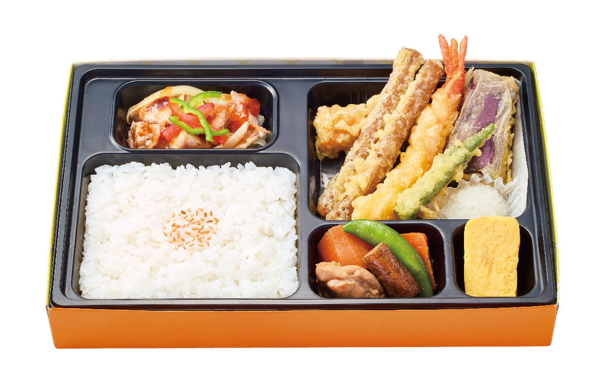 野菜をよりバランスよく食べたい方にぴったりの幕の内弁当。なすやオクラ、とうもろこしの夏野菜の天ぷらをメインに、大分産かぼす果汁が香る、しょうゆベースの大根おろしソースのおろし焼き豚しゃぶを添えている。他にも、たまごやきや、味の染みた鶏肉と根菜の甘辛煮など、さまざまなおかずが楽しめるお弁当。