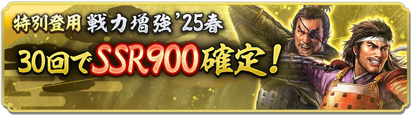 攻城戦の武将をピックアップした「特別登用・戦力増強 '25春」を開催。対象のSSR900武将の中からピックアップ武将を1名選択でき、10回ごとにSSR武将が確定、30回目にはピックアップ武将が確定で入手できる。開催期間は、2025年6月12日12時59分まで。