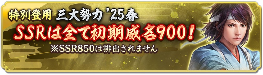 SSRがすべて初期威名900の「特別登用・三大勢力 '25春」を開催。織田、豊臣、徳川の三大勢力からピックアップされた8名のSSR武将が登場する特別登用となる。開催期間は、2025年6月19日12時59分まで。